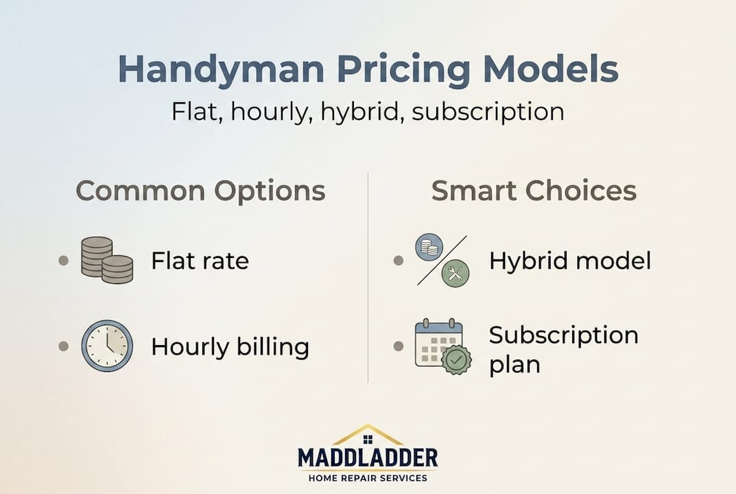 - Flexible handyman pricing includes flat rate, hourly, hybrid, subscription, and project-based models.