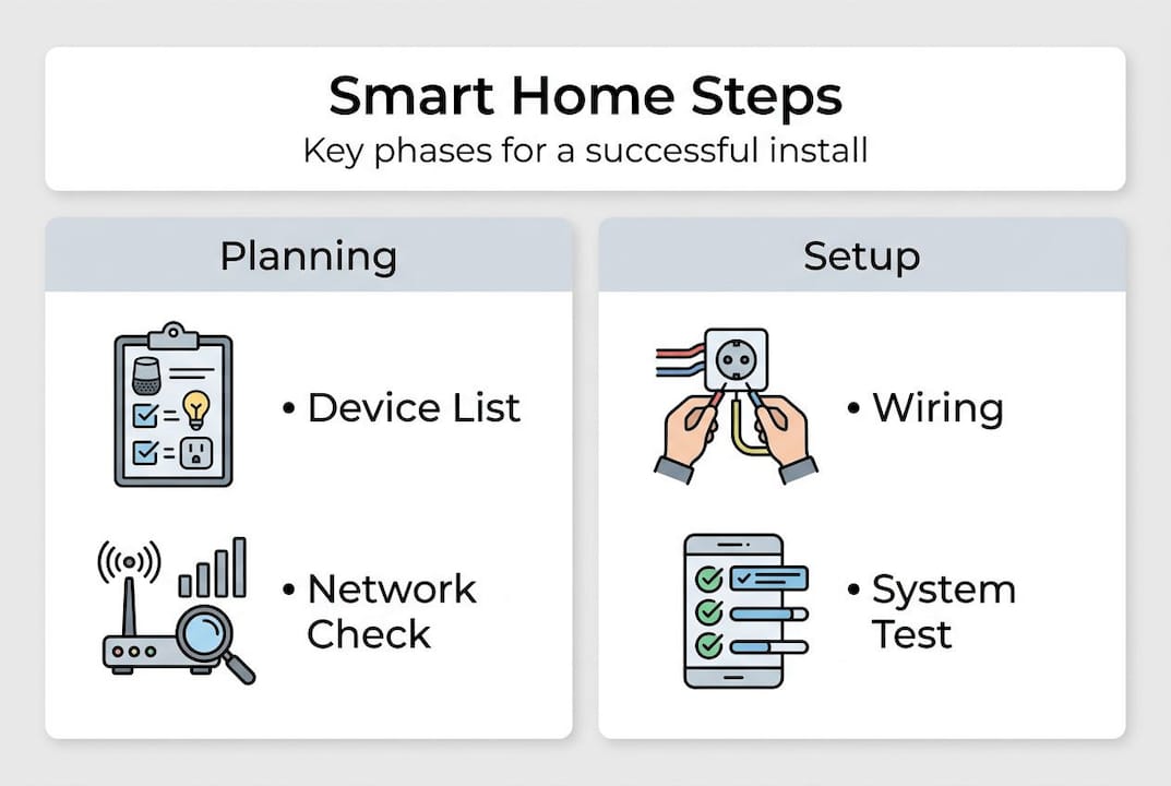 A solid installation steps methodology starts with a plan, moves to hub selection, installs core systems, connects voice assistants, then tests, automates, and secures the network. Each stage builds on the one before it.