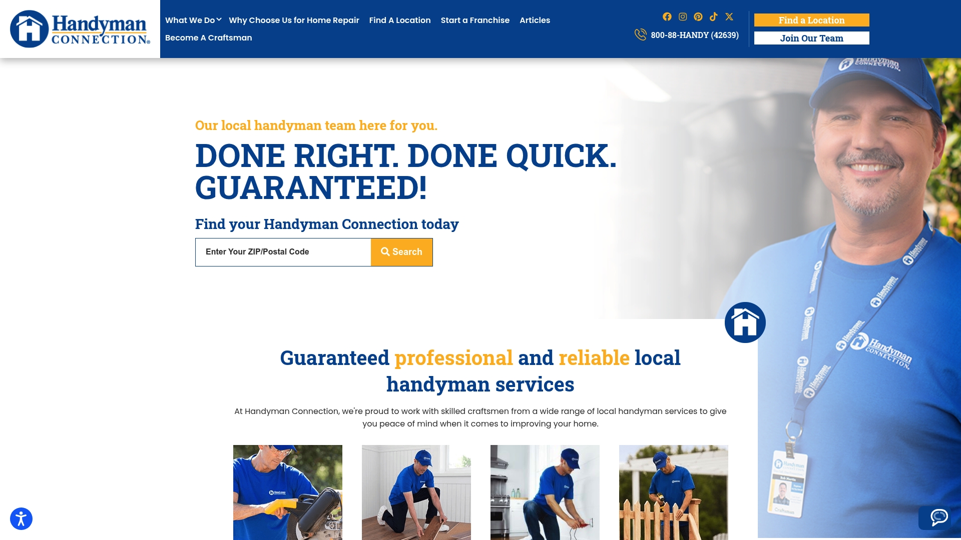 Handyman Connection offers a wide range of home repair and improvement services including carpentry, flooring, electrical work, fences, remodeling, plumbing, painting, and general maintenance. Each location is a locally owned and operated franchise staffed by certified craftsmen and supported by an online platform for service requests and information.